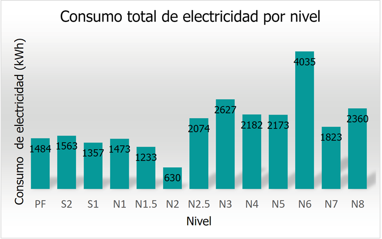En la Fig. 6, se muestra el gráfico de consumo total de electricidad por nivel para SPBC. Se puede apreciar que los niveles que inician a partir del mes de junio (del N2.5 en adelante) aumentan notoriamente el consumo, debido a que en el mes de mayo se realizó la instalación de la alimentación trifásica por parte de los trabajadores del CNFL. Además, al inicio de la construcción, la grúa torre funcionaba con combustible y, posteriormente, en el mes de mayo esta se energizó, por lo que también es una de las razones por las cuales aumentó el consumo por recibo mensual de electricidad, ya que los consumos de electricidad de las grúas torre rondan entre los 1500 y 1800 kWh por mes.