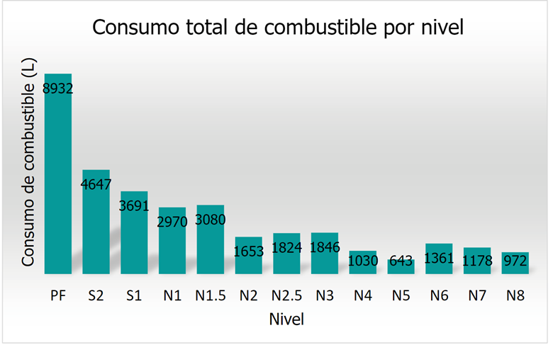 Se puede notar, en la siguiente Fig. 7, el consumo total de combustible para cada uno de los niveles del edificio de SPBC, donde la placa de fundación posee un mayor consumo de combustible, debido a que durante su construcción también se encontraban realizando los últimos trabajos para el movimiento de tierra y utilizando combustible para el funcionamiento de maquinaria como el backhoe. Además, durante la construcción de la placa de fundación se realizan más viajes para el transporte de materiales, debido a los equipos de alquiler como la formaleta.