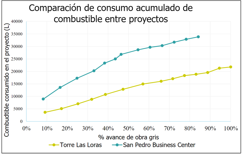 A continuación, se muestra la comparación del consumo de combustible total en litros contra el porcentaje de avance de obra gris en el cual se pueden observar mayores consumos en el proyecto SPBC, debido a que los consumos de maquinaria utilizada en campo y de los fletes de concreto del proyecto SPBC son mayores que los de TLL. Además, el proyecto TLL corresponde un edificio con un área de 13 765 m 2, mientras que SPBC posee un área 30 088 m 2; por esta razón, este presenta un mayor consumo total, tanto en electricidad como en combustible, a lo largo del avance de la obra. Asimismo, los m 3 de concreto colado en SPBC es, significativamente, mayor que la cantidad colada de TLL, lo que produce una mayor cantidad de fletes de concreto y, por ende, mayor consumo de combustible en SPBC.