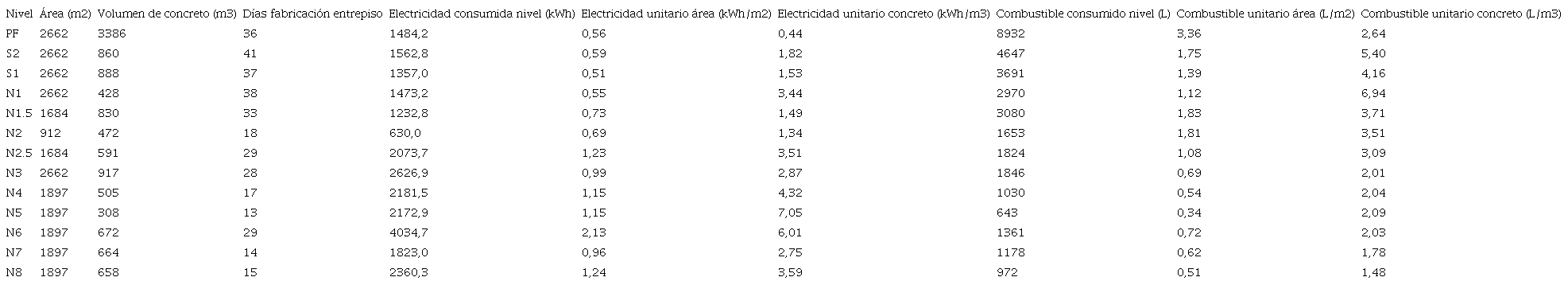 También, para la placa de fundación, se requirió más del triple de m 3 de concreto colado en comparación con la cantidad colada en los demás niveles, lo cual generó mayor cantidad de fletes de concreto y, por ende, mayor consumo de combustible.