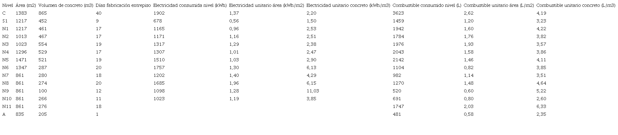 En los últimos niveles, se puede notar que bajó el consumo con respecto a los primeros meses, debido a que, a partir del nivel 7, el área de cada nivel disminuye a 861 m 2. Sin embargo, aunque los niveles 7, 8, 9, 10 y 11 poseen la misma área, hay niveles, como el N8 y N11, que tuvieron una mayor duración en su construcción y, por ende, un mayor consumo, debido al procedimiento en que se basa la metodología utilizada.
