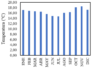 La temperatura media anual es 16.75 °C, la temperatura máxima y mínima absoluta es 18.99 °C y 4.3 °C, respectivamente [30]. Las temperaturas medias mensuales para el periodo de 2000-2015 se presentan en la Fig. 6.
