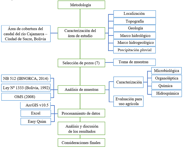 En este contexto, el siguiente trabajo tiene como objetivo caracterizar la calidad del agua subterránea presente en el área de cobertura del caudal Cajamarca de la ciudad de Sucre, verificando el atendimiento a los requisitos recomendados de calidad para consumo humano, específicamente la Norma Boliviana 512 [21], Ley Nº 1333 del Medio Ambiente [22] y las guías para la calidad de agua potable de la Organización Mundial de la Salud [23].