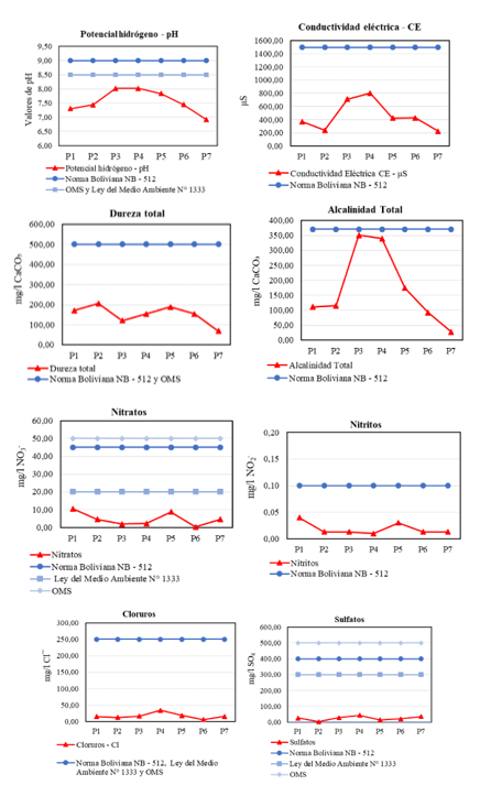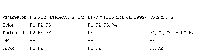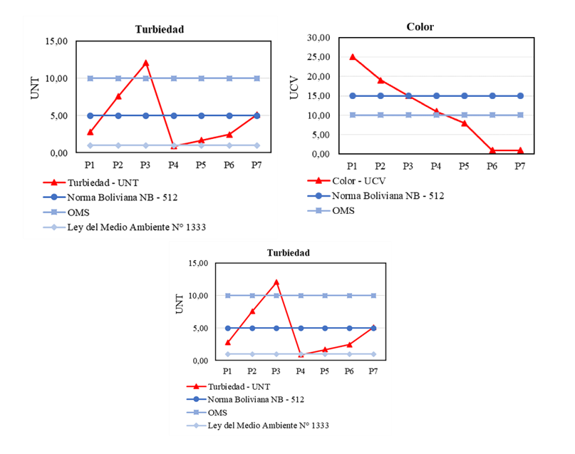 Para todos los valores obtenidos, se verificó el atendimiento a los requisitos mínimos del control de la calidad del agua para consumo humano de la Norma Boliviana 512 [21], Ley Nº 1333 del Medio Ambiente [22] y las guías para la calidad de agua potable de la Organización Mundial de la Salud [23].