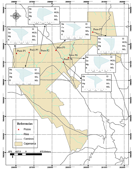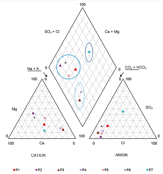 Se utilizó el diagrama de Piper para clasificar el agua de las muestras (Fig. 11). Se puede notar que, en el triángulo de los aniones, existe predominio del ion HCO3-(tipo bicarbonatado) en seis pozos de los siete, siendo solo uno (P7) tipo SO4-Cl (tipo clorurada - sulfatada). En el triángulo de cationes, se diferencian cinco grupos: a) P3, P4 y P7 corresponden al ion Na+; b) P1 corresponde a un tipo intermedio, teniendo como iones predominantes Na+ y Ca2+; c) P5 también es de tipo intermedio con predominancia de los iones Na+ y Mg2+, y d) P6 y P2 comparten los iones Ca2+ Mg2+ y Mg2+ Ca2+, respectivamente.