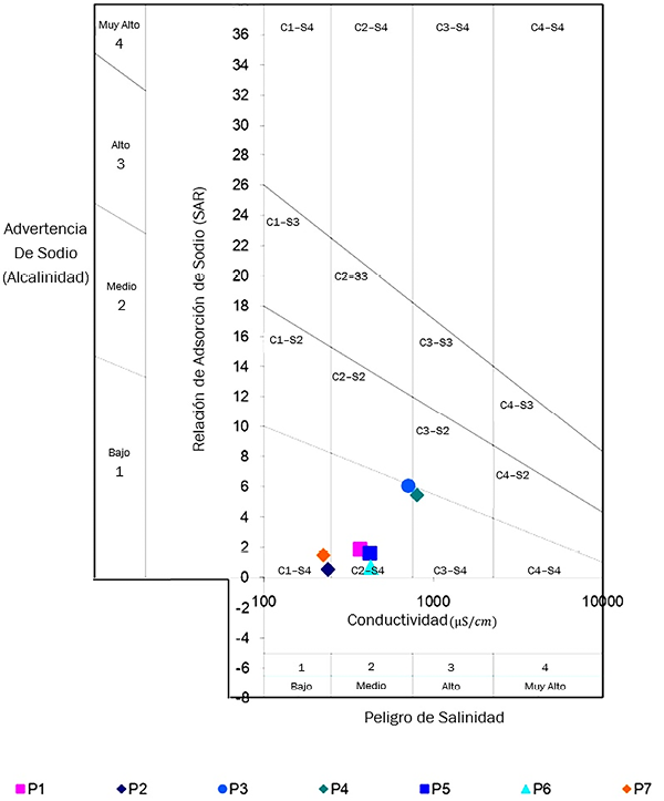 El diagrama de Wilcox clasifica de acuerdo con el riesgo de salinización y sodificación de la muestra por medio de parámetros como lo son CE y RAS. Para el sistema de aguas subterráneas en el área de estudio, se observan tres clasificaciones predominantes: a) C1-S1, correspondiente a baja salinidad y sodicidad baja, al ser aguas aptas para riego agrícola, P2 y P7; b) C2-S1, media salinidad y sodicidad baja, que constituyen aguas de buena calidad y aptas para la agricultura con bajo riesgo de sodio intercambiable, P1, P5 y P6, y c) C3-S1, alta salinidad y sodicidad baja, que constituyen aguas que pueden ser utilizadas en la agricultura bajo ciertas condiciones, P3 y P4 (Fig. 13).