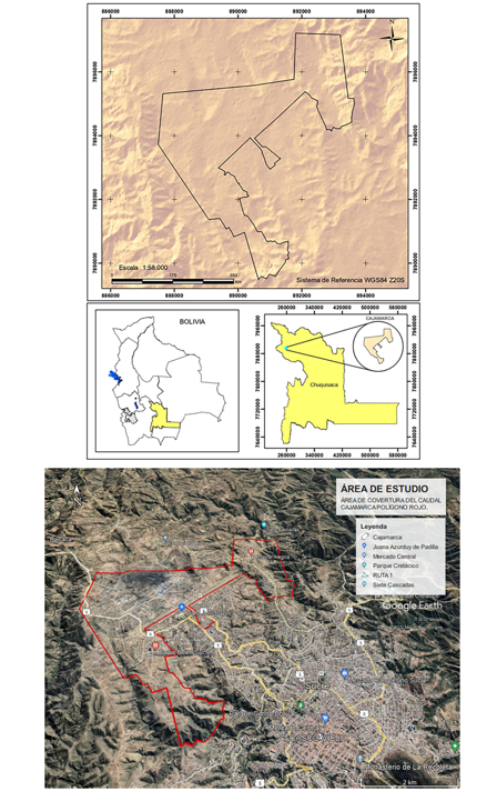 El área de cobertura del caudal Cajamarca comprende los Distritos 3 y 4 de la ciudad de Sucre, Bolivia (Fig. 1), denominadas como zonas periurbanas, con una superficie de 16.67 km2 y una población aproximada de 22 083 habitantes [20]. Los distritos en estudio son espacios rurales continuos a las áreas urbanas con superficies no urbanas (distritos 1 y 2). Ambos distritos se caracterizan por concentrar el 30 % de la población del municipio (80 981 habitantes) y por tener una tasa neta de migración de 6.58 % [20], [24]. Los distritos presentan industrias medianas y un reducido territorio destinando a la agricultura, destacando el cultivo de maíz, trigo, papa y leguminosas.