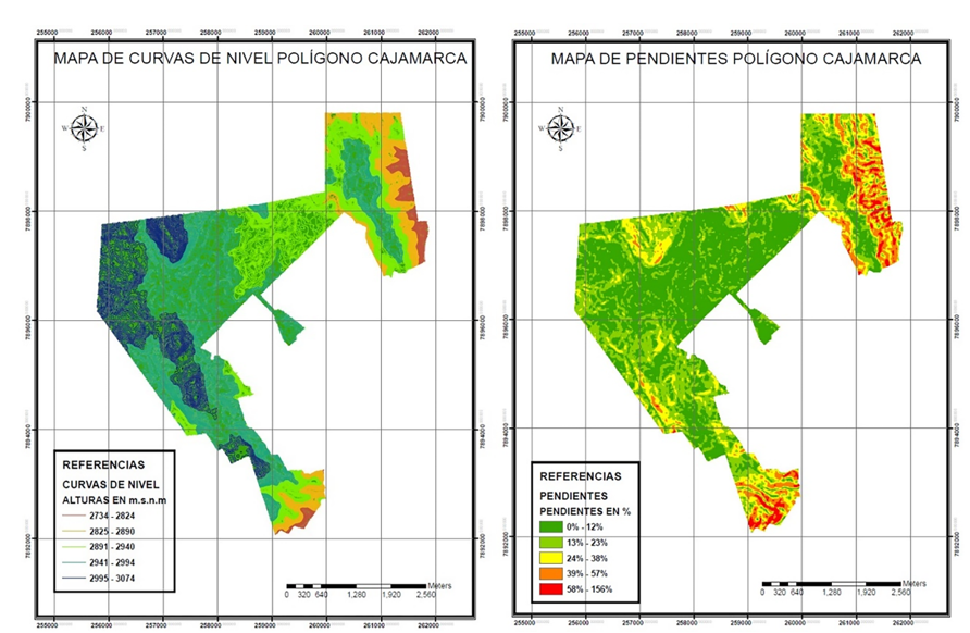 Fig. 2. a) Curvas de nivel y b) Pendientes del área de estudio.