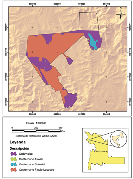 La Fig. 3 presenta el mapa geológico del área en estudio. La predominancia es de material rocoso fracturado, correspondiente al sistema ordovícico – cretácico. Las formaciones presentes son de edad paleozoica y del sistema silúrico con afloramientos de lutitas y areniscas friables de color amarillo pálido, intercaladas con pizarras gris oscuras a negruzcas compactadas. Asimismo, se observa una intercalación de roca cuarcítica con alto grado de silificación y la presencia de cuarzo lechoso a manera de delgadas vetillas, lo cual contribuye a un comportamiento impermeable de los sedimentos rocosos, especialmente a los 100 m de profundidad de perforación [26].
