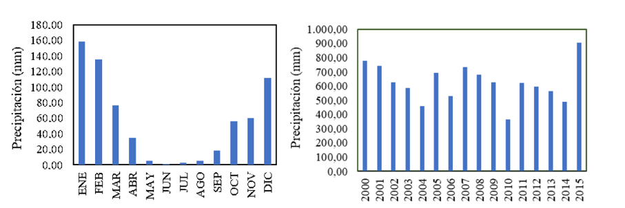 La Fig. 5a y 5b presentan los datos de precipitación media mensual y anual para el periodo 2000-2015.