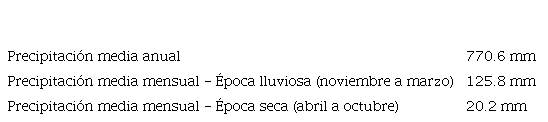 Los meses de mayor precipitación son los de diciembre, enero, febrero y marzo con 69.89 % de las precipitaciones totales (época lluviosa), y los meses con menos precipitación son mayo, junio, julio y agosto con 2.3 %.