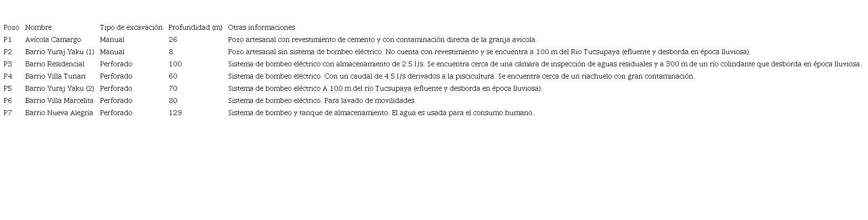 Los parámetros físico-organolépticos fueron analizados en campo: color, olor y sabor. En el parámetro de sabor se tuvieron dos excepciones: los dos pozos excavados manualmente (P1 y P2), ya que presentaban un olor predominante.