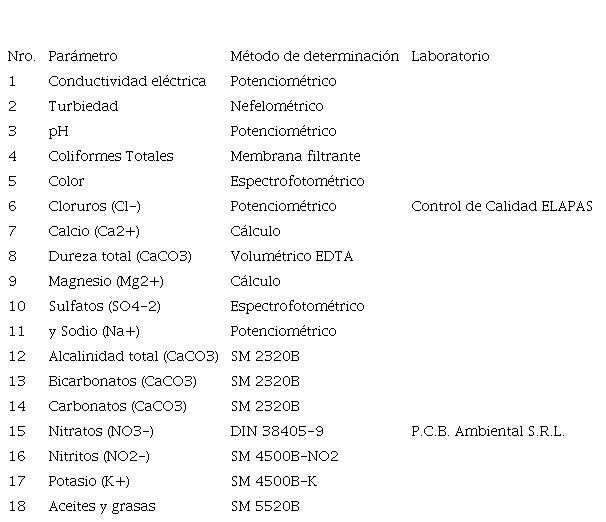 Los análisis se realizaron en el Laboratorio de Control de Calidad de ELAPAS, un total de siete muestras y otro grupo de siete parámetros fueron analizados en el laboratorio privado P.C.B. Ambiental S.R.L. El CUADRO III indica los parámetros analizados y los métodos de determinación utilizados.