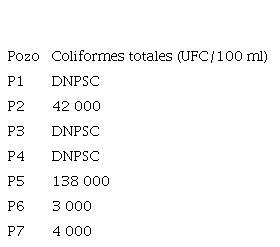Por medio del análisis microbiológico, se observa que las aguas subterráneas estudiadas exceden los valores permisibles de coliformes totales de la NB 512 [21](CUADRO IV). Los pozos P6 y P7 se encuadran en la clasificación de agua de clase D, con coliformes que no exceden los 20 000 UFC/100 ml. Los pozos P1, P3 y P4 dieron como resultado Demasiados Números Para Ser Contados (DNPSC), estos valores se deben al exceso de contaminantes patógenos, que puede deberse a las filtraciones de aguas superficiales contaminadas con aguas servidas. Los pozos P1 y P2 fueron excavados de manera manual por lo que la contaminación es posible en mayor porcentaje. El pozo P3 se encuentra a sólo 50 m de una cámara de inspección de aguas residuales y los demás pozos (P4, P5, P6 y P7) se encuentran cerca de los ríos colindantes.