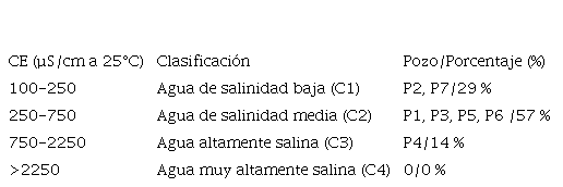 Debido a que la región presenta un clima árido o semiárido, es de esperar que parte de las aguas superficiales y subterráneas presenten, periódicamente, problemas de salinidad y sodicidad. Según el criterio de salinidad del [39], el P4 se encuentra en la categoría de agua altamente salina (C3), ya los demás pozos se clasifican como de media (C2) o baja salinidad (C1) (CUADRO VI).