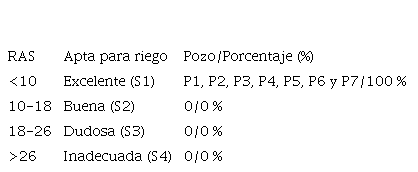 Todas las muestras cumplen el criterio de adsorción de sodio (RAS) (CUADRO VII) del [39], indicando que son clasificadas como aguas con bajo contenido de sodio, por lo tanto, no ocasionarán alteraciones en la permeabilidad del suelo y son aptas para riego.