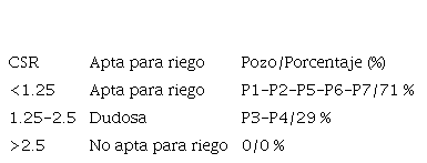 Según el Reglamento de Ley N° 1333 de medio ambiente [22], las aguas que excedan los 2.5 mEq/l de carbonato de sodio residual (CSR) son consideradas como no aptas para riego; sin embargo, las muestras no exceden este límite (CUADRO VIII). Si el valor de CSR está entre 1.25 y 2.5 mEq/l, el agua se clasifica como dudosa, puede ser utilizada para riego agrícola con ciertos criterios, los pozos P3 y P4 se encuentran en esta clasificación. Ya si el contenido de CSR está por debajo de 1.25 mEq/l, indica un agua con buena calidad para riego, los pozos P1, P2, P5, P6 y P7 atienden a este criterio.