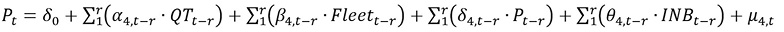 with QTt the yearly fuel demand per capita (gasoline or diesel), Fleett the number of registered vehicles per capita, Pt the fuel price per liter, and INDt the Gross National Income per capita; further, r is the optimal amount of lags (selected to maximize a set of information criteria), and μi,t the random error term. The model formed by this set of equations was estimated for annual data of Costa Rica, 1965-2019.1 Gasoline price and Gross National Income per capita are expressed in real terms. Models were estimated separately for gasoline and diesel. Fleett was defined by the number of cars to model gasoline demand, as this is the fuel mostly used by private vehicles; for diesel demand, the sum of trucks and buses was used due to their role in consuming most diesel fuel for transport in Costa Rica (data on the number of vehicles per fuel is not available in national statistics, requiring the use of these proxy variables). All data series were transformed into natural logarithms.