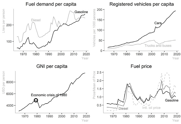 The most likely exogenous time series, those of price, show larger fluctuations than other variables —and indeed one could argue they do not exhibit the increasing trend of fuel demand, registered vehicles per capita, and Gross National Income per capita. These fluctuations coincide with, and likely respond to, the mean price of oil in the international markets (Fig. 1). Additionally, it is also apparent diesel prices have been larger than the mean towards the end of the study period, specifically after 2008 when the subsidy to diesel price (in the form of a large price differential with gasoline) was substantially reduced. This also explains why the dispersion in the diesel price data is larger (coefficient of variation of 0.47) than in the gasoline price data (coefficient of variation of 0.32), albeit both are similar to each other and less than dispersion in international oil prices (coefficient of variation of 0.68).