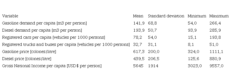 Elasticities were estimated by Singh and Vargas [3] for gasoline (-0.33 of price and 0.47 of income) and for diesel (-0,20 of price and 0,33 of income) demand during 1972-1992, after controlling for vehicle ownership. Adamson [4] used a time series of 1957-1996 to estimate, for gasoline and diesel, elasticities of price (-0.26 and -0.18, respectively) and income (1.41 and 0.88, respectively). Neither Singh and Vargas [3] nor Adamson [4] found significant cross elasticities between fuel prices. Leiva [7], in his most recent energy elasticity estimates for Costa Rica, used data of 1984-2007 to calculate price and income elasticities for diesel demand (-0.14 and 0.97, respectively) and premium gasoline (-1.03 and 1.29, respectively); regular gasoline estimates only included income elasticity (1.05) because the price elasticity was found to be positive, likely because of substitution of premium gasoline during high price periods.