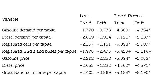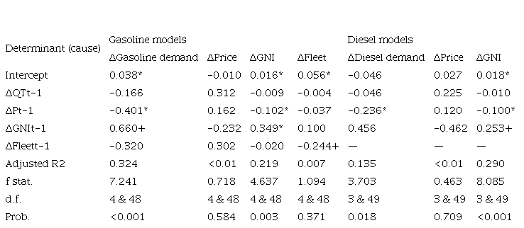 As for the gasoline demand, it is also generally in line with theoretical expectations: the model presents an adjusted coefficient of determination of 0.32 (the largest among all equations in both models), a large f statistic, and significant determinants for the first difference of price (negative) and Gross National Income per capita (positive). The only unexpected result is motorization (i.e., the first difference of cars per capita) was not a significant determinant of per capita gasoline demand.