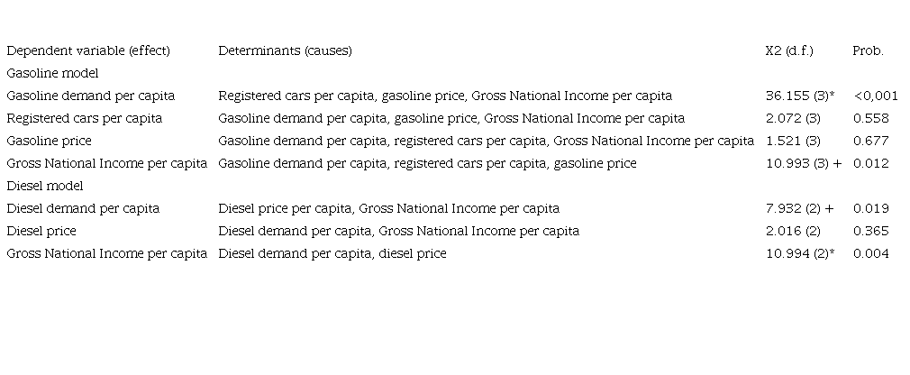 As can be seen in TABLE III, both gasoline and diesel demand are Granger caused by other time series, as well as Gross National Income per capita (in both models). Similarly, there is no causal effect on price, neither for gasoline nor for diesel, which is consistent with the relation of price with the international oil prices (see Fig. 1). In general, the hypothesized relations between income (Gross National Income per capita), fuel price, and fuel demand are supported by the model. However, it is noteworthy that the variable cars per capita is not caused by other potential determinants, in particular by the income proxy variable, as mode choice has been linked to household income (e.g. in origin/destination travel surveys, [14]).