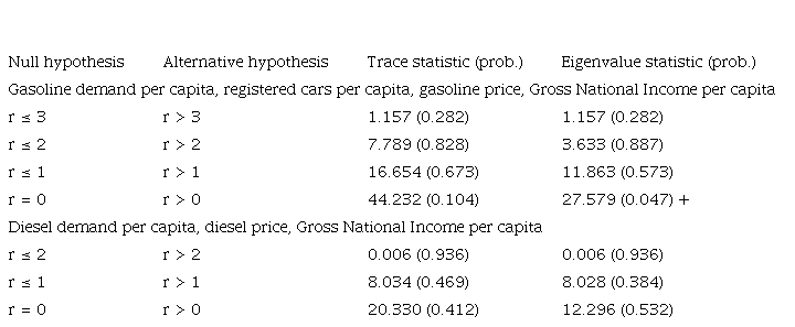 The results of TABLE IV show hardly any cointegration exists between the time series: the Eigenvalue statistic for the gasoline fuel VAR model suggests the existence of one cointegration relation, but this is not confirmed by the trace statistics. Neither does the diesel fuel VAR model display any evidence of cointegration. It should be noted that estimating the (unreported) vector error correction model (VECM) for gasoline fuel does yield a significant long-run error correction term for gasoline demand and Gross National Income per capita as dependent variables, suggesting this to be the cointegrated time series. Yet this VECM sheds limited information on the relations between determinants: because the optimal VAR model is of lag 1, there are no short-run relations in the VECM, only the long-run error correction term (which, in turn, is only significant for two of four possible variables).