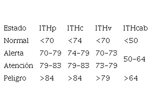 Cabe resaltar que, entre los datos obtenidos, se tienen dos series de humedad concernientes a la humedad diaria ascendente (Hr,AD) y decreciente nocturna (Hr,DN) en cada región, por lo que los índices ITH se calcularon dos veces, cambiando dicho parámetro para observar su comportamiento. Para analizar el nivel de confort animal, se tomaron rangos de los índices para estados de normalidad, donde no se presentan riesgos fisiológicos y de bienestar; alerta, donde la posibilidad de presentar afectaciones es de bajo a moderado; atención, cuya posibilidad de afectación es moderada a alta; y peligro, con una alta probabilidad de comprometer la actividad metabólica del animal, y que presente daños en su salud [19], [16], [17], [6], estos intervalos se resumen en el CUADRO I. Es de notar que para el índice ITHcab, concerniente a equinos en condiciones de actividad física [19], solo se definen tres intervalos.