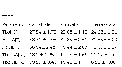 Los parámetros meteorológicos obtenidos mediante interpolación ponderada para las diferentes regiones de forma anual respecto a la temperatura de bulbo seco (Tbs[°C]) humedad relativa diaria ascendente (H_(r,AD)[%]), humedad relativa nocturna descendente (Hr,ND [%]), temperatura de bulbo húmedo calculado, teniendo en cuenta la humedad relativa diaria ascendente y la nocturna descendente Tbh,DA[°C] y Tbh,ND [°C] así como su variación se muestran en el CUADRO II, donde se puede observar que la mayor temperatura y su variación corresponde a la región de Caño Indio, seguido de Tierra Grata y de Miravalle al igual que el rango de variación que se presenta de humedad relativa.