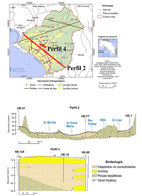 La Fig. 9 muestra el mapa hidrogeológico de la zona donde se destacan dos perfiles geológicos de la zona en análisis (perfiles 2 y 4).