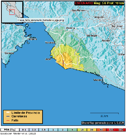 Para ambas fallas, como para el resto de fallas activas en Costa Rica, el Laboratorio de Ingeniería Sísmica de la Universidad de Costa Rica ha planteado escenarios simulados de eventos máximos posibles de acuerdo a la longitud de cada falla, para un sismo con una profundidad de 10 km. Para el caso de la Falla Tárcoles, para un sismo de magnitud Mw 7,0 con una profundidad de 10 km, se podrían esperar en la zona de estudio aceleraciones cercanas a los 0,20 g; mientras que, para la Falla Herradura, para un sismo de magnitud Mw 5,6 con una profundidad de 10 km, se podrían esperar en la zona de estudio aceleraciones cercanas a los 0,20 g [24][25]. Las Fig. 10 y 11 muestran los mapas de aceleración máxima para las respectivas fallas y respectivos sismos a una profundidad de 10 km.