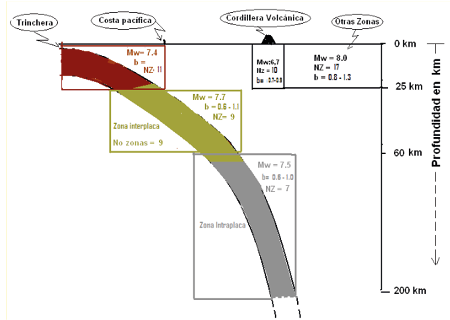 La Fig. 12 muestra el modelo en perfil de las zonas sísmicas en profundidad propuesto por Climent et al.[22] para Costa Rica.