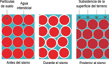 Según [4], la licuación inducida por sismos se refiere a los fenómenos de generación sísmica de exceso de presiones de poro y el consiguiente ablandamiento de suelos granulares saturados, a tal punto que el mismo se comporta como un líquido perdiendo su rigidez. No obstante, hay distintos fenómenos, como explosiones, vibraciones de máquinas, entre otros, que pueden producir el mismo efecto. Para fines de este trabajo, se considera la licuación como producto de la vibración del terreno por el paso de ondas sísmicas. Los suelos susceptibles a licuación suelen ser principalmente arenas y, en menor grado, limos y gravas. La licuación resulta de la tendencia de la estructura granular de un suelo saturado a colapsar y contraerse, o densificarse, cuando se somete a una carga cíclica, representada por la aplicación repetida de esfuerzos cortantes causados por una sacudida sísmica. Antes de la licuación, las fuerzas de contacto entre las partículas sólidas proporcionan rigidez y resistencia al suelo saturado. La tendencia a la contracción de la estructura del suelo conduce a una transferencia de la carga que había sido transportada por la estructura granular al agua intersticial que llena los vacíos entre los granos individuales del suelo, lo que resulta en un incremento de la presión de poro. Cuando la presión del agua intersticial aumenta, las fuerzas de contacto entre los granos se reducen, el suelo se deforma más fácilmente y, en el caso límite, las partículas del suelo pueden perder el contacto completamente entre sí y se suspenden. Cuanto más suelto es el suelo, mayor es el potencial de contracción bajo carga cíclica y es más fácil que el suelo se licue. La Fig. 1 muestra un esquema del proceso de licuación descrito.