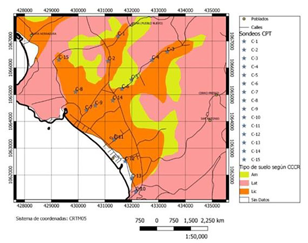 La Fig. 17 muestra la ubicación de los sondeos CPTu realizados en una imagen aérea de la zona de estudio, y la Fig. 18 la ubicación de los sondeos respecto al mapa de suelos del Código de Cimentaciones de Costa Rica [1].