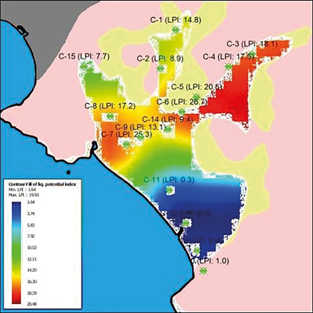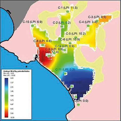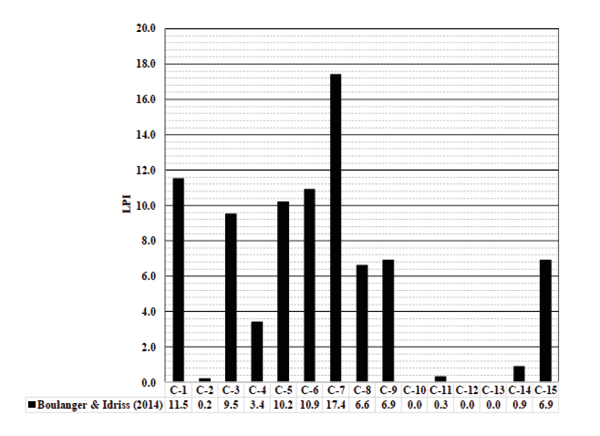 El índice resultante depende del espesor de las capas licuables en los 20 m superiores, la proximidad de estas capas a la superficie del suelo y la cantidad por la cual el factor de seguridad contra licuación es inferior a la unidad. A diferencia del procedimiento de Ishihara [8], el LPI se puede aplicar a un perfil con múltiples capas licuables. El LPI puede oscilar entre 0 (sin capas con un factor de seguridad menor a 1 en los 20 m superiores de suelos) hasta un máximo de 100 (el factor de seguridad contra licuación es cero para todas las capas en los 20 m superiores). Un análisis de datos de 45 sitios que licuaron durante el terremoto de 1964 en Niigata, Japón mostró que se produjo una licuación severa en sitios donde el LPI > 15, y poca licuación ocurrió donde el LPI < 5 [6]. Se han desarrollado mapas de amenaza de licuación utilizando el marco de LPI para regiones sísmicas en muchas partes del mundo [4].