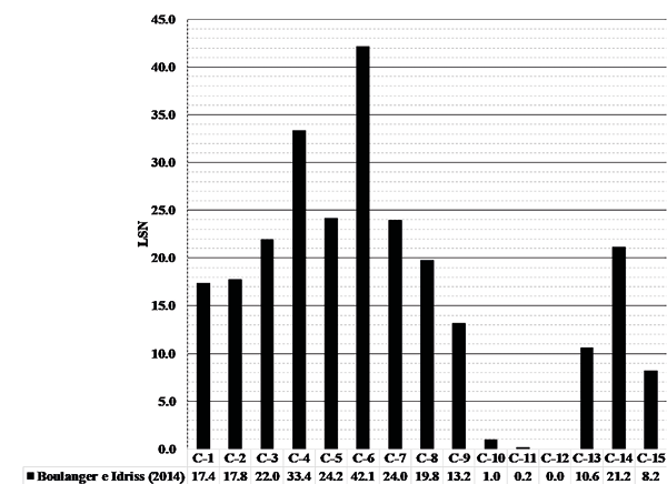 Por último, para la zona identificada como de potencial de daño intermedio, correspondiente a los sondeos C-1, C-2, C-8 y C-15, los valores estimados de LPI y LSN permiten determinar que para la zona de los sondeos C-1, C-2 y C-8 se podrían esperar daños altos, asociados a asentamientos en el rango de los 10 a 20 cm, mientras que, para la zona del sondeo C-15, se esperarían daños moderados. A partir de la estimación de los valores de asentamientos, los resultados del sondeo C-2 corresponden a un nivel de desempeño moderado, mientras que los sondeos C-1, C-8 y C-15 están asociados a un nivel de daño alto, con valores estimados de asentamientos entre 9 y 10 cm. Para el sondeo C-2, los asentamientos estimados son de casi 5 cm.