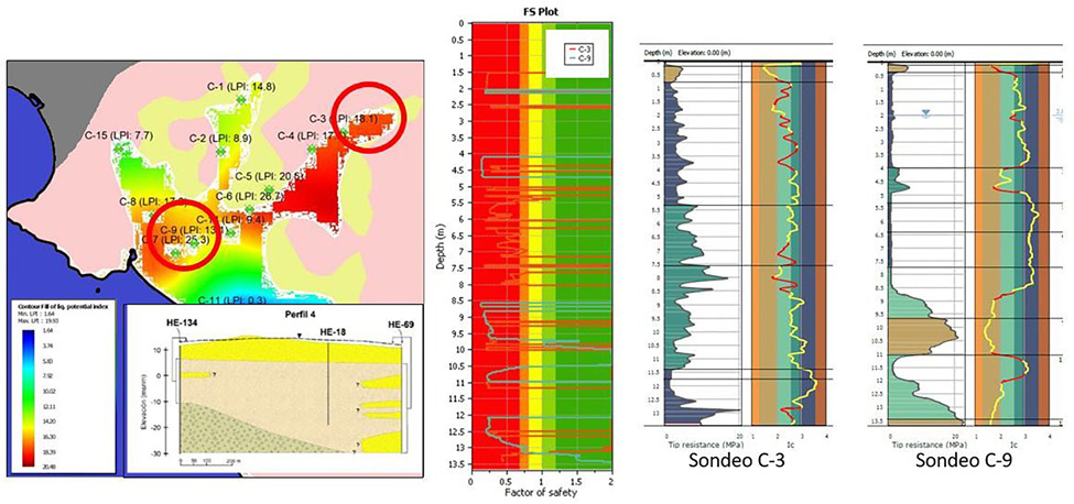 Se analizan ahora las condiciones estratigráficas del terreno y la interacción entre capas correspondientes a los resultados obtenidos. En cuanto a la zona de bajo potencial de licuación, correspondiente a los sondeos