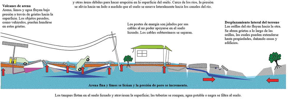 La pérdida de resistencia del suelo asociada con la licuación puede provocar grandes deformaciones del suelo y la incapacidad del suelo licuado de soportar los materiales superpuestos, incluidas estructuras hechas por el ser humano. Las consecuencias colaterales pueden incluir la pérdida de vidas y la destrucción de viviendas e infraestructura crítica. La recuperación después de la licuación del suelo inducida por un sismo puede ser costosa, de decenas de millones a miles de millones de dólares, y puede llevar muchos años [4]. LaFig. 2muestra, esquemáticamente, posibles efectos de licuación sobre infraestructura durante y luego de un sismo.
