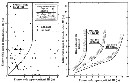 La influencia de una capa de sello no licuable, de espesor H1, en la contención de la manifestación superficial de la licuación de una capa subyacente, de espesor H2, fue cuantificada por Ishihara [6], basado en observaciones de campo. Ishihara relacionó el mínimo valor necesario de H2 para que la licuación se manifestara en la superficie de H1. La Fig. 3 muestra las curvas límite H1-H2 desarrolladas por Ishihara a partir de observaciones de campo en varios sismos y criterio profesional. El punto en el cual las curvas límite se vuelven verticales representan un espesor de capa de sello luego de la cual no hay manifestación superficial de licuación, independientemente del espesor de la capa licuada subyacente.