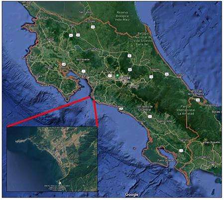 La zona de estudio corresponde al distrito de Jacó, cantón de Garabito, provincia de Puntarenas, Costa Rica. La propia ciudad de Jacó, cabecera del distrito homónimo, se ubica, aproximadamente, entre las coordenadas WGS84 latitud 9,636038°, longitud -84,627556° y latitud 9,596517°, longitud -84,619060° y cuenta con una población cercana a las 18000 personas [3]. La Fig. 4 muestra la ubicación de la zona de estudio respecto a Costa Rica.