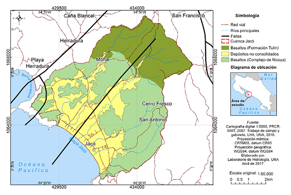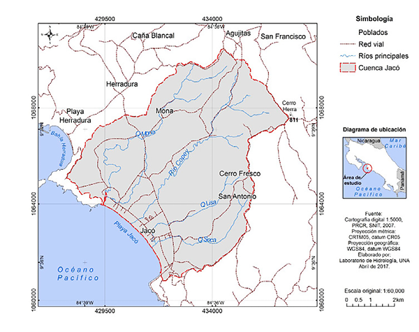 De acuerdo con Gómez et al. [16], la zona en estudio se ubica dentro de la cuenca Jacó, la cual tiene una extensión de 47 km2, y consiste en tres micro cuencas correspondientes a los ríos Pueblo Nuevo (Mona), Copey y Naranjal. Un acuífero se ubica en la parte baja y media de estas micro cuencas, asentado en depósitos no consolidados, con una extensión aproximada de 15 km2. La Fig. 5 muestra el área de la cuenca Jacó.