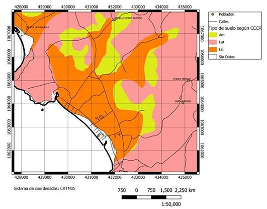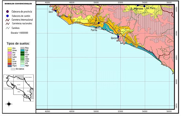 Se presenta en la Fig. 6 el mapa de tipos de suelos de la Hoja Quepos (escala 1:600000) del Código de Cimentaciones de Costa Rica [1], en la que se destaca la ubicación de la ciudad de Jacó en suelos que se clasifican como suelos aluviales. La zona de análisis corresponde a la resaltada en color naranja en laFig. 7, con un área de aproximadamente 11,3 km2.