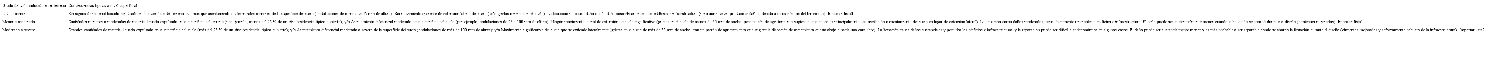 El Ministerio de Comercio, Innovación y Trabajo de Nueva Zelanda [5] propone tres grados de daño por licuación del terreno. Esta clasificación fue desarrollada basada en las observaciones realizadas a raíz de la secuencia de sismos que afectó a la región de Canterbury, Nueva Zelanda, en los años 2010 a 2011. El Cuadro I muestra una descripción de las consecuencias a nivel del terreno según el grado de daño.
