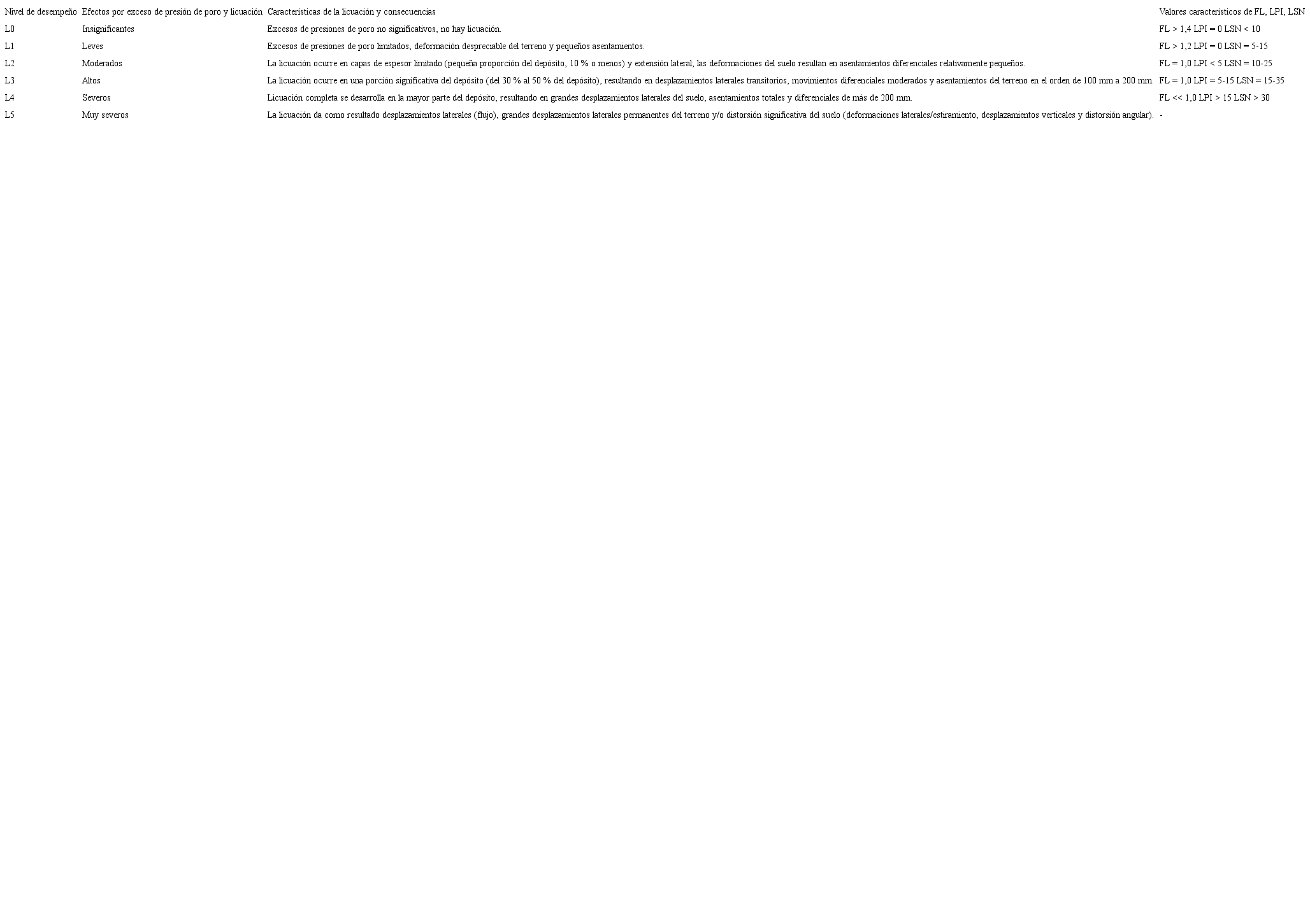 Las magnitudes de los desplazamientos de suelo inducidos por licuación están relacionadas, generalmente, con el factor de activación de licuación, FL, y al espesor total de la capa licuada. Basado en una interpretación de estas relaciones, [13] propone un resumen del desempeño de depósitos de suelos licuados, el cual se muestra en el Cuadro II.