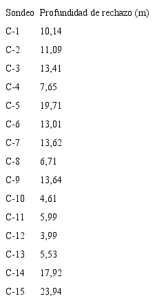 Se realizaron en total quince sondeos CPTu con una profundidad máxima de investigación correspondiente a la de rechazo del cono, la cual se muestra en el Cuadro III.
