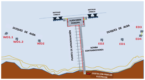 Para maniobrar, posicionar y amarrar dispone de siete Duques de Alba (Delfín) (ver Fig.3). De un lado, el ED1, ED2, ED3 y ED4, y del otro lado el WD1.1, WD1.2 y el WD2. Todos ellos con bolardo, poste de iluminación y escalera de acceso lateral.