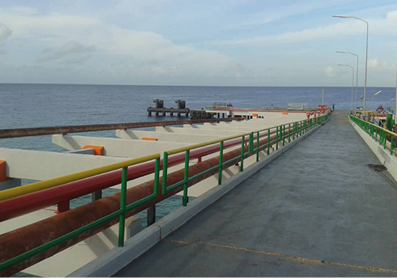 En relación con la descripción del puente de aproximación (ver Fig.4.) a la plataforma principal, este presenta un plano liso y de tránsito libre, que está construido con un suave declive desde su extremo superior en tierra hasta el extremo inferior en la plataforma principal. Es soportado por cincuenta y tres pilotes de los cuales diecinueve son verticales y treinta y cuatro inclinados 6:1 (de acuerdo con los datos suministrados por el responsable del muelle, que a su vez extrajo la información de un informe de pilotes de buceo industrial que se refiere a los planos de construcción CUR 61120/505). Tiene a lo largo cinco postes altos para alumbrado; cuenta con rejas de protección personal a ambos lados, en todo su recorrido. Existe en el lado abierto del puente de acceso, aproximadamente a dos tercios de su largo (desde el borde de tierra), una plataforma independiente en la que se instalan equipos (bombas) para el combate de incendios, que impulsan agua de mar a todo el sistema contra incendios de las instalaciones en tierra, así como al muelle, pero no está bajo la responsabilidad del personal del muelle.