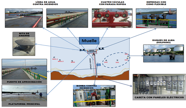 En cuanto al contexto interno (el muelle propiamente), presenta como estructura central la denominada plataforma principal, además, cuenta con un puente de aproximación, una línea de agua contra incendios y válvulas con parada rápida, defensas cónicas de goma, bitas de amarre, duques de alba, caseta con paneles eléctricos, postes de luz nocturna y bomba contraincendios, distribuidos de acuerdo con lo mostrado en la Fig.3.