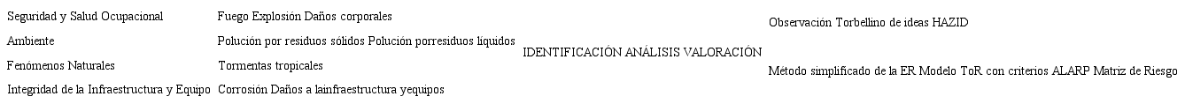 Del torbellino de ideas, surgen áreas de riesgos, a saber: seguridad y salud ocupacional, ambiente, fenómenos de la naturaleza e integridad de los bienes, posteriormente, mediante la observación y el HAZID, descritos en la sección anterior, se identifican ocho riesgos objeto de la evaluación y los posibles escenarios; para cada uno de ellos se determinaron las fuentes, causas, consecuencias y zona de afectación, tal como se indicó en el Cuadro III, como ejemplo para el riesgo fuego.