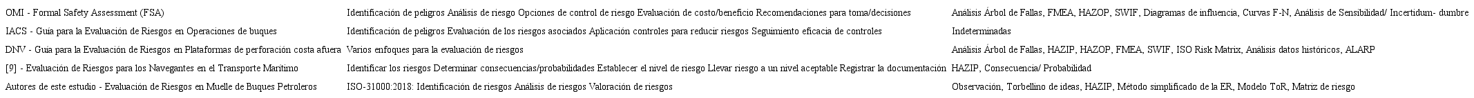 En el Cuadro II, se observa la comparación de metodologías y técnicas entre cuatro opciones citadas y la utilizada en este estudio. Las técnicas presentadas en [1] y [3] son un conjunto de opciones, que de ningún modo ofrecen preferencias para algún conjunto de riesgos en particular. En el caso objeto de estudio, sí se precisan las técnicas para cada etapa de la ER.